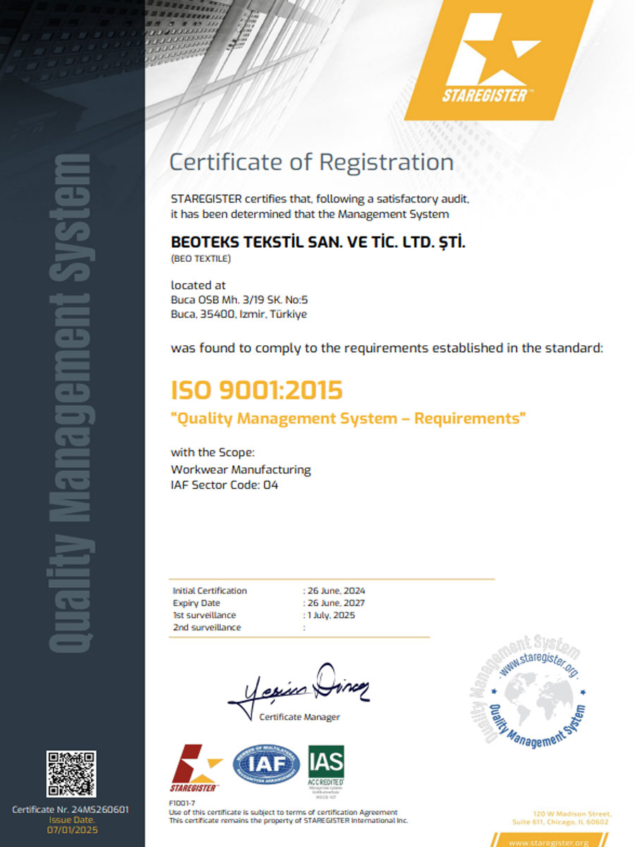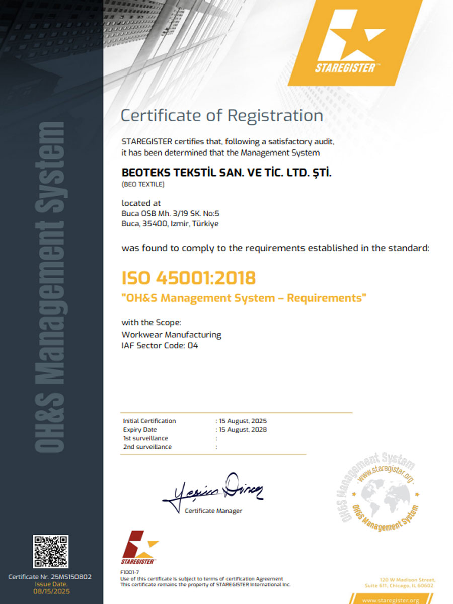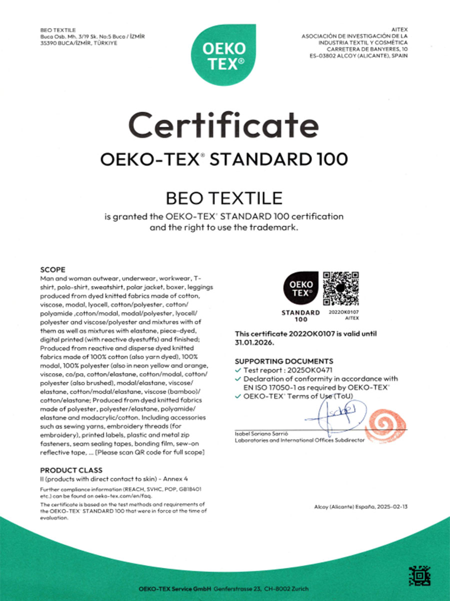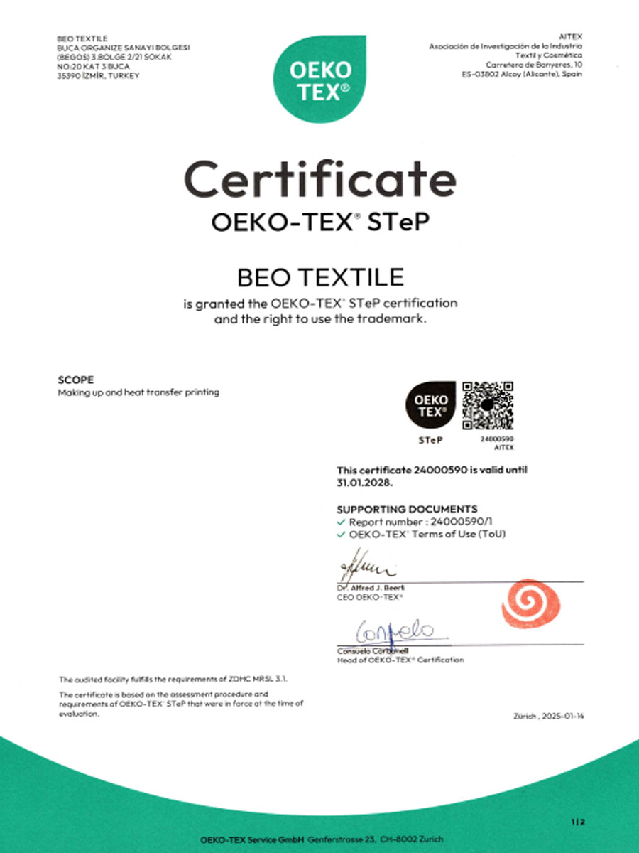 Certificates Our Certificates Discover and experience the reliability that sets us apart in the B2B textile industry. OEKO-TEX STANDARD 100 OEKO-TEX STeP ISO 9001:2015 ISO 14001:2015 ISO 45001:2015 Your Trusted Textile Partner “Reach out to us today and discover how Beo Textile can support your business with quality and reliability.” Contact US